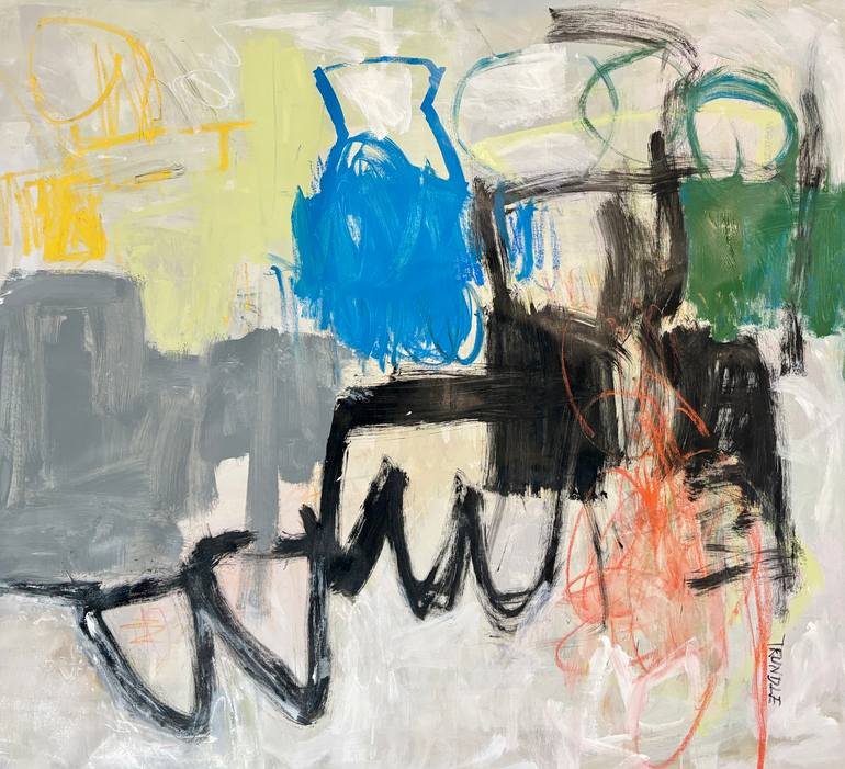 Charlottesville, Virginia abstract artist. Represented by Capital Artists Collective, (Washington DC), Serena and Lily, One Kings Lane, Harris Fine Art, (Charlottesville, Va), Art Des Femmes, (NYC) Please see my "COLLECTIONS" section to view art organized by style. ARTIST STATEMENT: Sarah Trundle is a Charlottesville, Va. painter who, after beginnings in representational art, now works primarily in abstraction. Bold and colorful geometric shapes are the hallmarks of her work which, along with the very paint itself, are what she considers her "subjects". Her unique and many-layered paintings range from brightly colored, playful abstracts, to serene, monochromatic horizon line paintings- the seemingly disparate styles representative of her exploration of the relationship and between order and chaos that fuels her process. Her work results from a largely intuitive process that explores the interdependence of these seemingly opposite but interdependent concepts. Each painting emerges from a constantly shifting and evolving process. Her approach is one of obscuring and re-defining, of complicating and consolidating, of taking risks to see what surprises emerge to inform each subsequent step. The successes are when this process eventually leads to a final balance that gives her that “aha, its done!” moment. The simplicity of the final product thus often belies the complexity of its creation. It is this struggle and process, this push pull between simple and complex, between random and intentional, between order and choas, between apparent and obscured, this "what if...?" line of thinking, that Sarah sees as an integral part of the finished painting as a whole. She thus strives to give the viewer a window into this struggle, by often leaving edges raw and unfished, marks in-competely rubbed or scraped out, and remnants of early layers, shifted lines and shapes, indecision and risks, all still visible. She is represented by several galleries nationwide and she is honored to have her work in numerous private and public collections. Sarah holds a bachelor’s degree in psychology from Dartmouth College and a Masters Degree in Social Work from Virginia Commonwealth University. She started her career as a full time artist after having worked many years as a mental health therapist (who always dabbled in art).