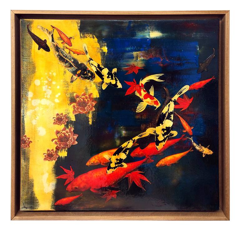 A delicate flow of beautiful Koi fish, through crimson maple leaves and dusky pink lilies. In Japan, Koi fish are traditionally symbolic of prosperity and good fortune. Set to a background of prussian and cobalt blues, with warmth from washes of sunshine yellow and burnt sienna inks, giving a golden...
