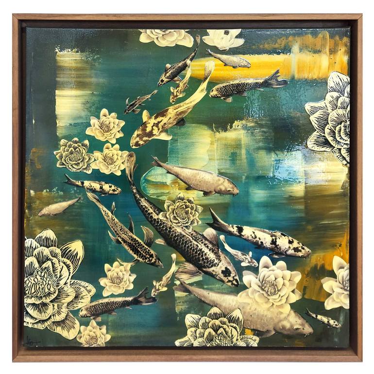 A delicate flow of beautiful Koi fish. In Japan, Koi fish are traditionally symbolic of prosperity and good fortune. Monochrome Koi are set to a background of blues, greys, and white, with warm pops of yellow, featuring details of lilies. Ink washes and a varnish finish add texture and depth. The c...