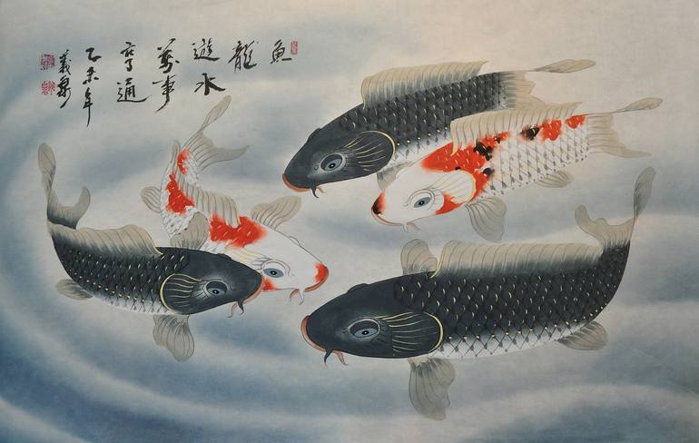 Korean Water Color painting Five Carp Fish Original Signed Unique Original Korean Traditional Water Color Painting without frame Materials: Hanji, Traditional Korean paper handmade from mulberry trees SIGNATURE: It is signed on the painting Perfect for: - your collection of Asian art - the fan o...