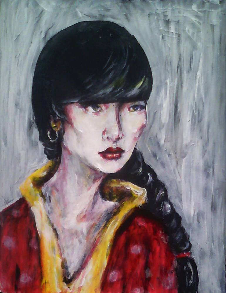 acrylic paint on paper paint size 25x 20cm . 2018. fashion model series fashion model portrait akimoto kozzue . japannese popular model with classic hair style