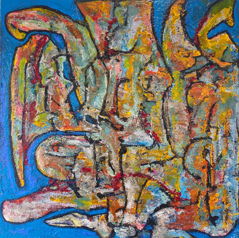 "کوردستان" is a 36x36 inch abstract acrylic painting on canvas. I built up the layers with multiple colors, then cut into them repeatedly with an X-Acto knife. I filled in the cuts with ink, oil pastels, and more acrylics. Finally, I sealed it all with a gloss varnish. The painting is a vibrant expl...