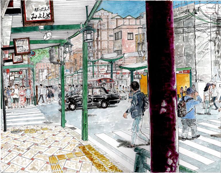 This drawing was made from a photo I took in Kyoto. This drawing represents the main commercial artery of old Kyoto, Shijo Dori avenue. One can admire on this avenue, arcades in a slightly retro style dating from the 60s in steel painted "English green" color under which the onlookers stroll in fro...