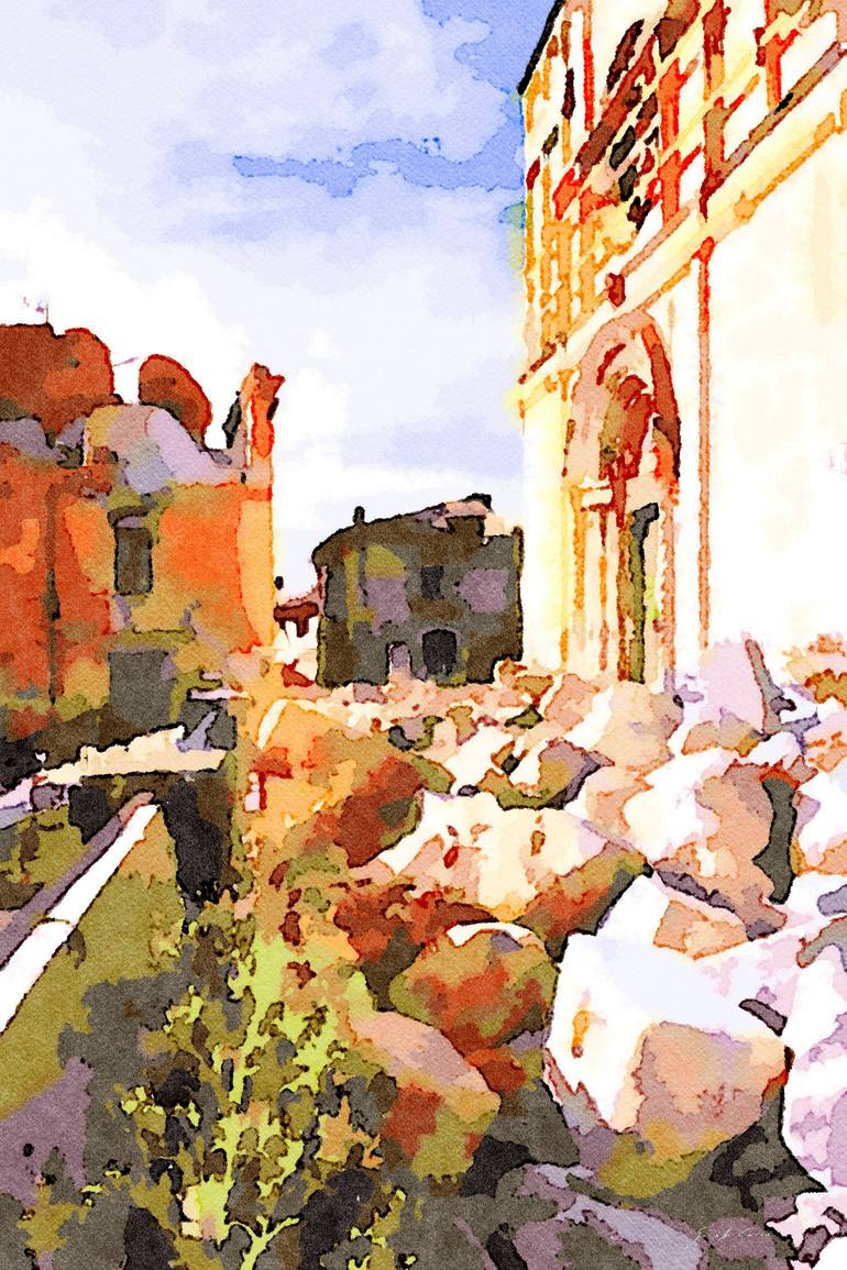 This watercolor is part of a series of photographs taken during two days, in September 2009 and in April 2010, here and there in the city of L'Aquila, after the earthquake. With the original photographic shots I realize digital watercolor painting, submitting them to processing steps in the post-pr...
