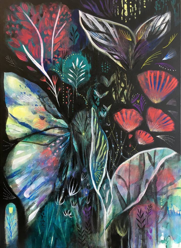 The painter plays with the organic forms of life and combines them with colors that shine out of the deepest black. The flapping of the butterfly's wings, the quiet growth of grass and leaves, and the silence from which everything originates and into which everything passes. The artwork wants to ins...