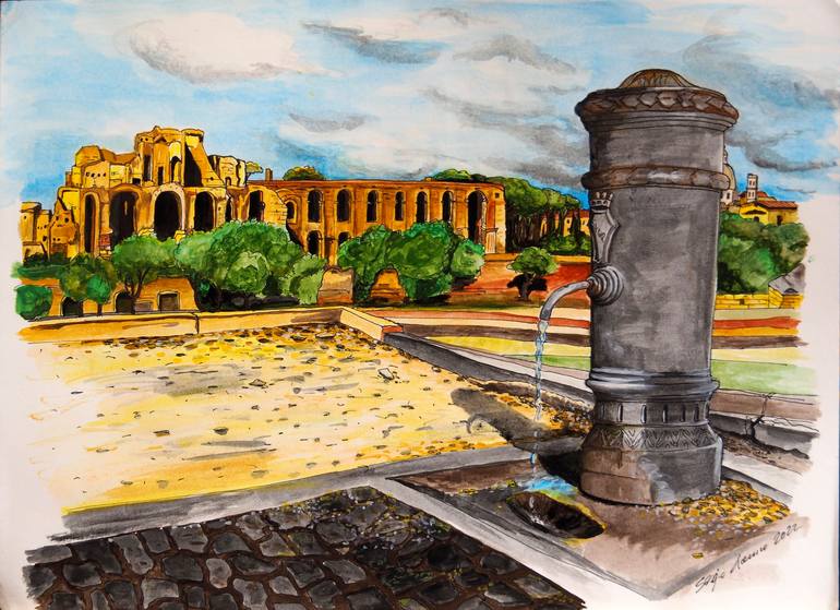 "Er Nasone" is the typical fountain of the capital of Italy, and in the background a view of the ancient Roman aqueduct