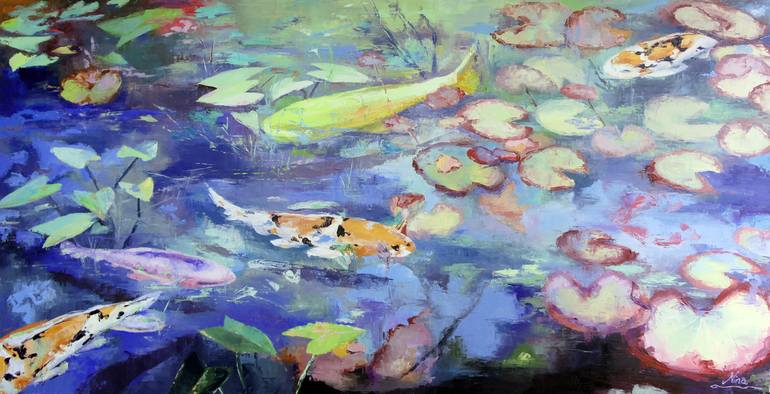 This fish pond was inspired by Monets garden and Monet's paintings. Through my travels in France and influenced by the pond at the de Young museum in San Francisco, I finally choreographed my own fish pond. It has the ability to give a calming feeling to its onlooker and is a painting that I am tru...