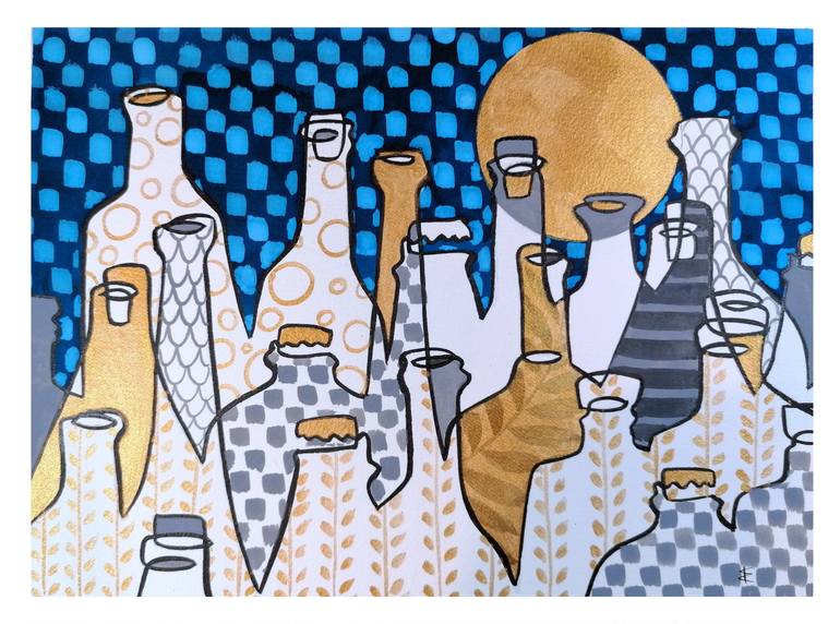 -illustrazione di natura morta surreale contemporanea a colori di skyline di una citta' di bottiglie -i tratti e lo stile sono unici originali e di mia fattura -il disegno è realizzato su carta fabriano 100% cotone 300 gr con inchiostro di china -firmato sulla parte frontale -le dimensioni totali s...