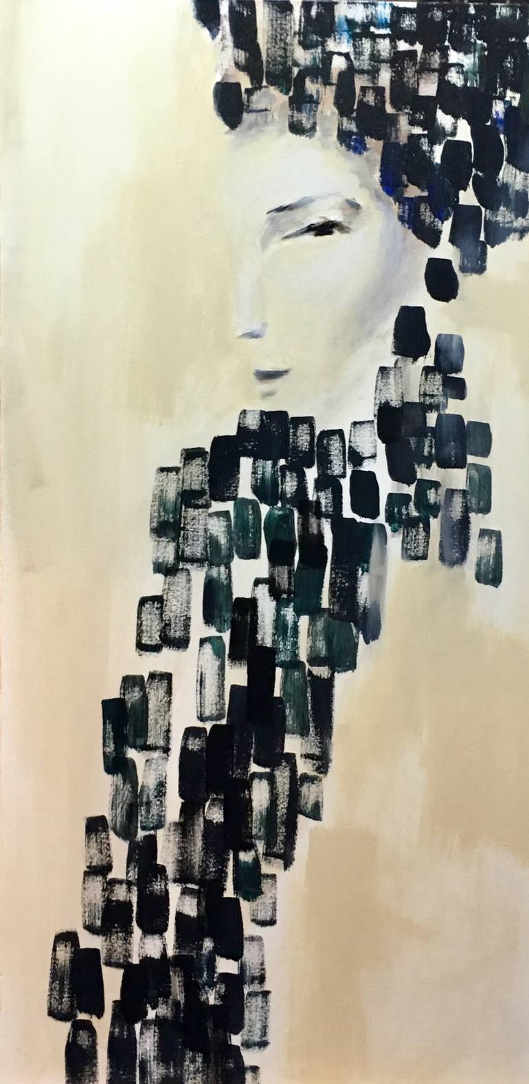 The Vision of The Female presence with a Dramatic concentration of her Essence in just one eye with the subtle movement description thru the rectangular shape ,leaving a very open space around her to achieve the Minimalist effect .its like to see a Gustav Klimt in our times