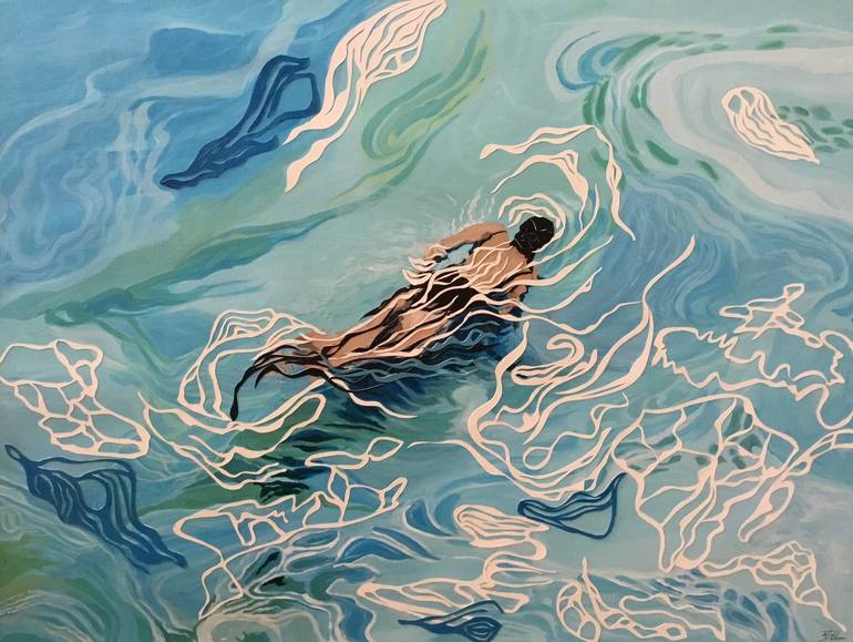 La peinture est pour moi une écriture et il n’y a pas un jour où je n’ai pas envie de remplir ma page blanche… Chaque émotion qu’elle soit triste ou joyeuse m’insuffle ce besoin de peindre. Née à Paris dans une famille d’artiste, mes premiers émois picturaux, je les ai ressentis pour les impressionnistes, j’ai adoré leurs palettes, leurs ambiances! Renoir, Manet, Pissarro, Van Gogh, Caillebotte et tant d’autres… la douceur de vivre, la sérénité qui se dégageaient de ces peintures ne pouvaient qu’émerveiller la petite Parisienne que j’étais emportée dans ce rythme soutenu que celui d’une capitale. Cela a sans aucun doute contribué à forger les rêves et les valeurs que je voulais avoir dans ma vie! J’ai eu beaucoup de plaisir à peindre des paysages figuratifs mais aussi des portraits féminins inspirés par la nature mais c’est lors de mon installation en Italie, à Venise que mon art a pris une autre direction! J’ai réalisé à quel point l’eau, ses reflets, ses inversions, ses fragmentations ont servi de révélateur! Ces anamorphoses perpétuelles constituent tout le questionnement que l’on peut avoir sur ce que l’on est, qui nous sommes, pourquoi nous sommes ici plutôt que là, quelle apparence donnons nous vraiment aux autres, sommes nous sincères… et bien d’autres questions! J’aime travailler mes tableaux de manière fragmentée, casser les lignes, multiplier les couleurs, les tordre…. Je peins uniquement à l’acrylique sur des supports tel que le papier ou le bois J’espère donner l’envie de se pencher au-dessus de l’eau et de s’amuser à se déconstruire pour renaître autrement…