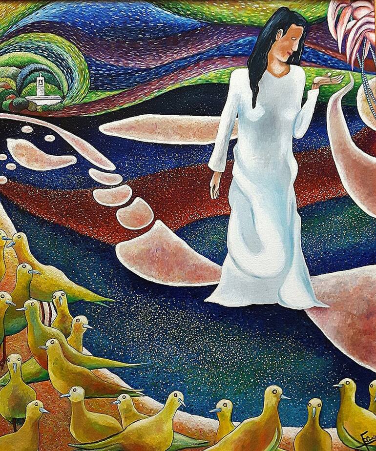 This painting was inspired by the reading of an old story by Gabriel Garcia Marquez "The Night of the plovers". All this perfectly reflected the pictorial moment I was experiencing, when Paul Gauguin was my reference artist: hence the certainly tropical and almost timeless setting. The story was ab...