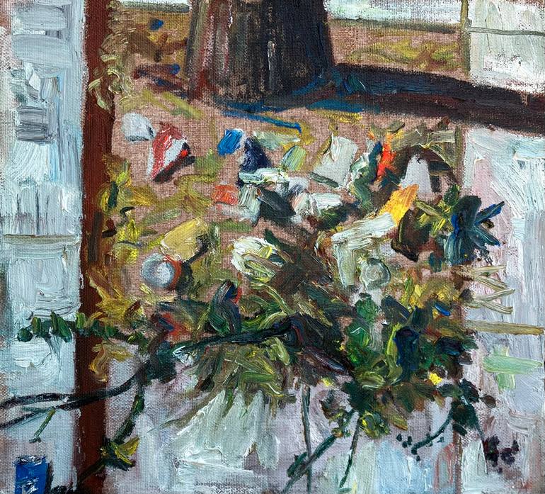 Oil painting on burlap mounted on cardboard of a sidewalk in Los Angeles.