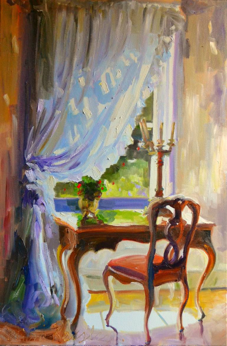 A very special setting of a view of the garden peaking through a sheer voile curtain. This is a larger painting of a previous study I have done before, and really love the way it has turned out.