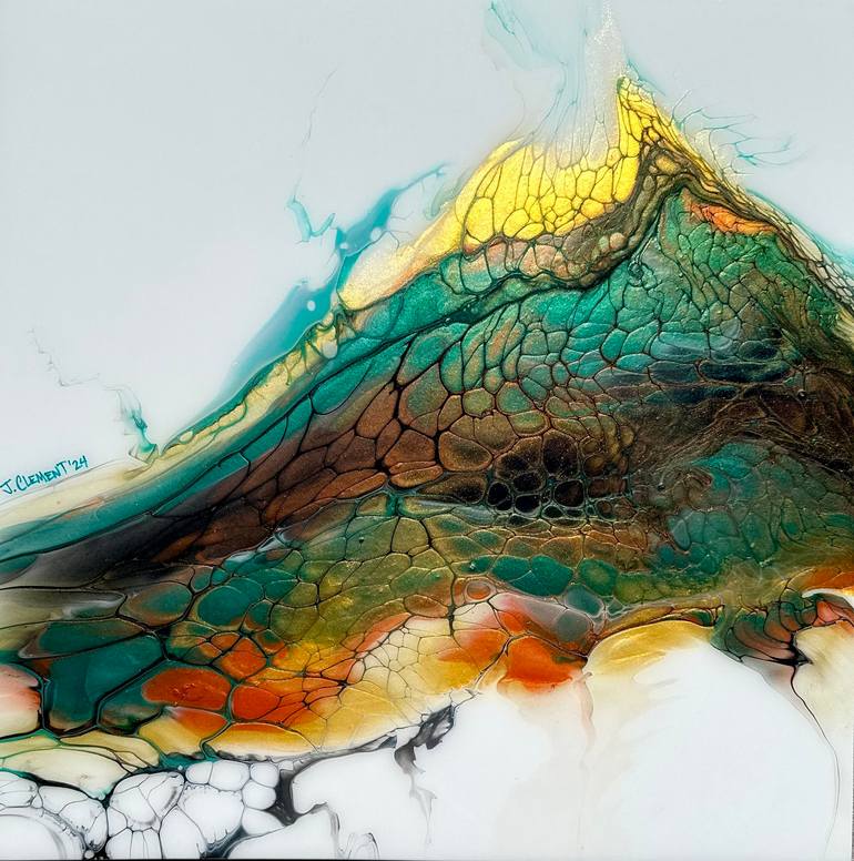 This is a vibrant artwork on a perfect handmade wooden “canvas”. The piece is 16”x16”x2” and comes ready to hang with ease. The warm color palette is full of lush earth tones, and the gold and copper metallics really pop off emerald green shimmer, which is all overlaid by a delicate black lacing...