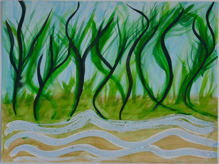 If you dive off the island of Menorca, you can observe how these algae dance on the seabed. The greenest are the youngest, becoming darker over time... I wanted to imitate that movement through my first oil painting. It's a piece of cardboard painted in oil, and the shiny dots are real algae, made...