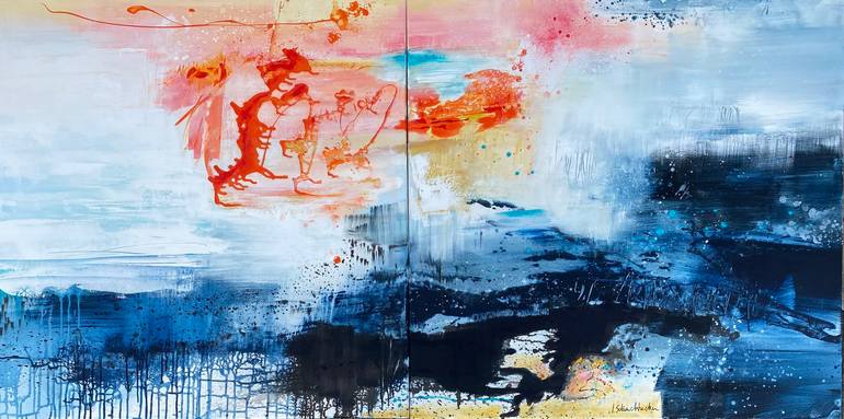 Dreamlike tale of a lucky day. Neptune ´god of the sea, send in Space a lucky charm, to celebrate spring ! The sea horse dragon is thé symbol of clairvoyance, courage and patience . The painter, by projecting the color on his canvas, made this story emerge !