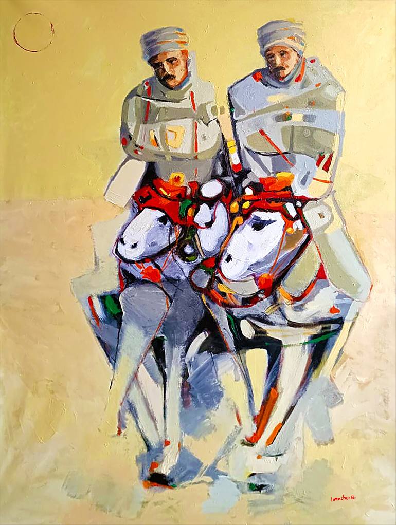 Imache Nacir is an Algerian painter born on April 27, 1992 in Algiers. He is known for his Sumi figurative artistic style and his keen interest in North African identity. Berber and Arab symbols play an essential role in his work. In 2016, at the end of his studies at the Ecole des Beaux-Arts in Algiers, the artist took off for another course, this time in Italy. There, he enrolled at the Perugia Academy of Fine Arts to deepen his artistic knowledge. Glorified by a diploma from the aforementioned Academy in 2019, he decided to continue his specialized studies at the IUAV University in Venice. An experience that allowed him to further explore his artistic practices, broaden his horizons and benefit from renowned Italian artistic influences. Throughout his career, Imache Nacir has distinguished himself by winning numerous awards for his outstanding contribution to the fine arts. Thanks to his extensive studies in Algeria and Italy, Nacir has developed a unique vision and solid technical mastery, which is reflected in his picturesque works. His success and recognition testify to his commitment to his art and his constant desire to push back the boundaries of his creativity. The artist, or simply Nacir, draws his inspiration from Algeria's rich culture, exploring themes linked to the region's identity and diversity. His use of the Sumi figurative style, a traditional Algerian painting technique, adds a unique touch to his creations. Bright colors and strong contrasts are recurrent elements in Nacir's works. He creates expressive compositions highlighting cultural symbols and motifs of Berber and Arab origin. His work has often been described as a blend of tradition and modernity. Nacir has participated in numerous exhibitions in Algeria and abroad, where his distinctive style has been widely appreciated. He continues to seek out new forms of artistic expression and experiment with different materials to further enrich his work and sharpen his creativity.