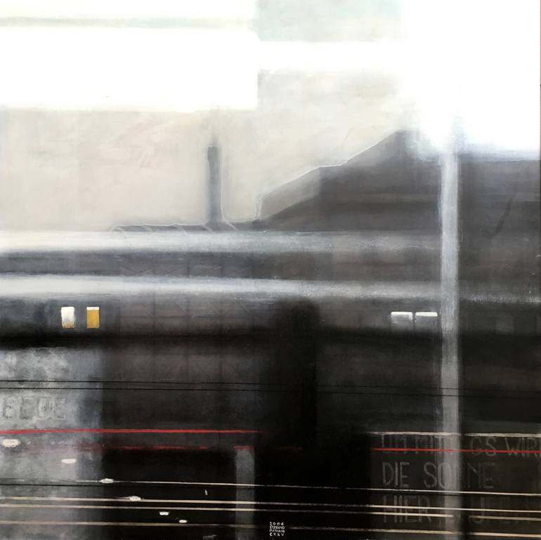 From the LIMITI DI TRANSITO serie. Urban themes. Magical atmospheres in balance between metaphysical memories and images of industrial architecture. Surface finish with natural beeswax. The painting is sold with wooden frame in price.