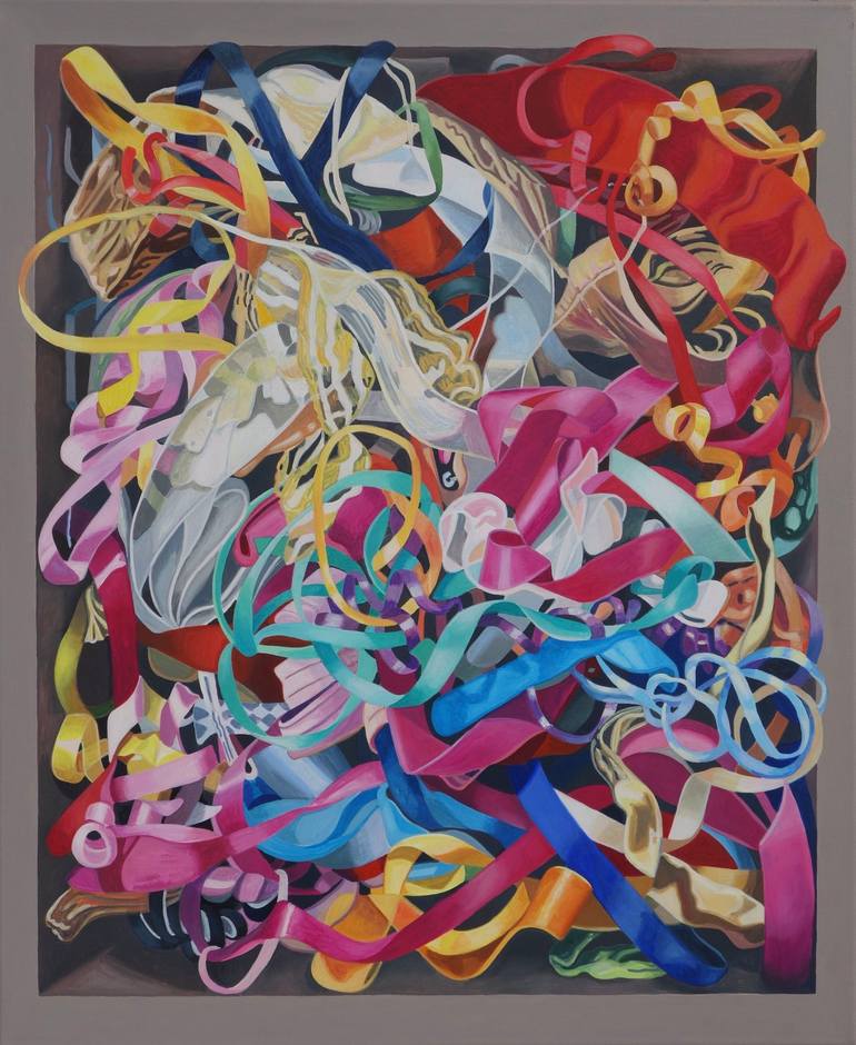 Looking into a drawer full of colorful intertwined gift ribbons inspired me to create this colorful acrylic painting and is the start of a new series “LIO”. The Spanish word “LIO” means tangle in a figurative sense. The painted frame of the drawer gives the motif great depth and three-dimensionality...