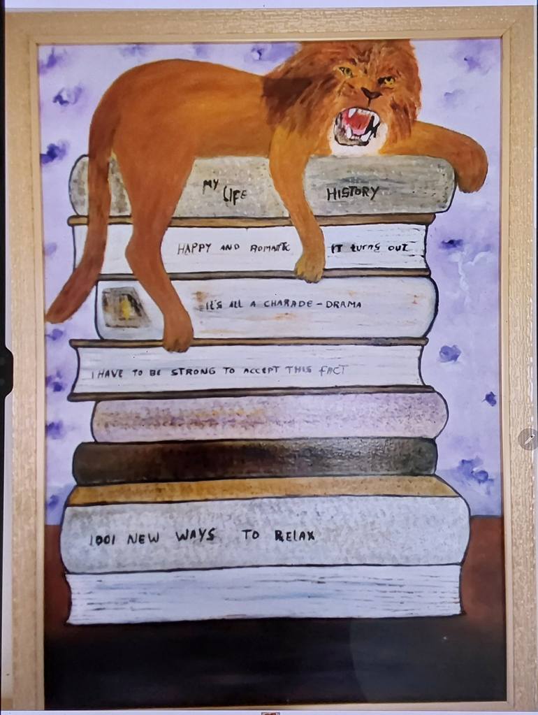 LION IN STORY this is original oil painting on canvas strong character and beautiful animal to inspired me to make paint it I make by brush with Windsor oil color mixed with linseed oil on quality of canvas gresso last varnishing and framed with gold color