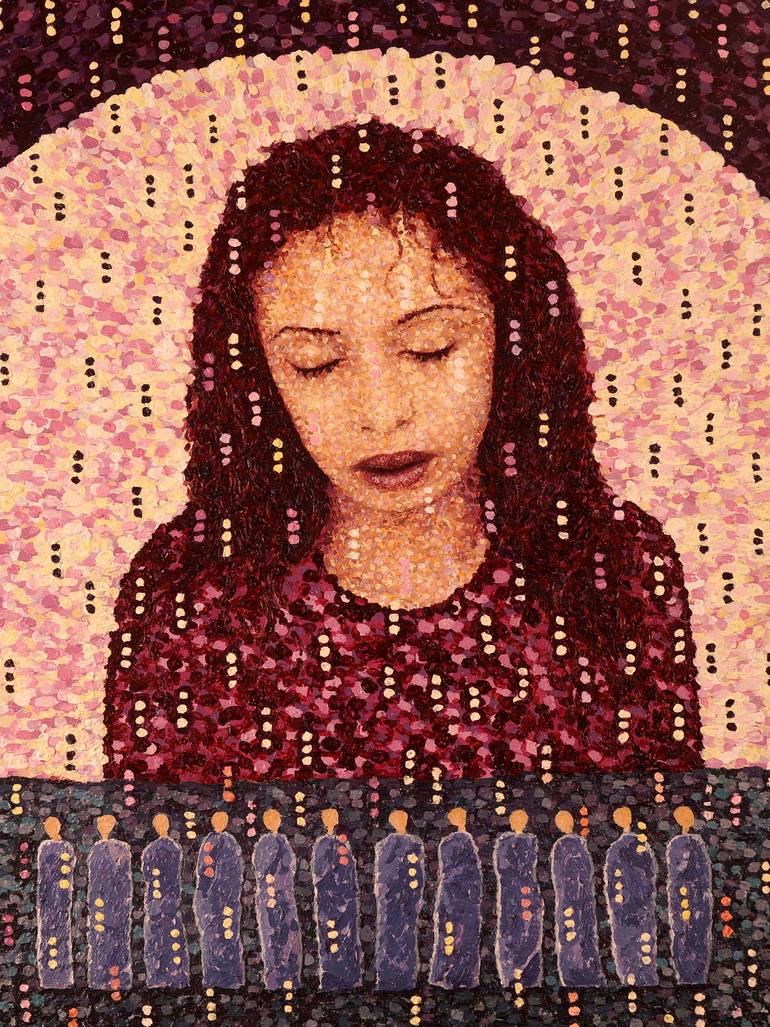 The painting shows the Our Holy Virgen Mary and the12 apostles in the rain.
