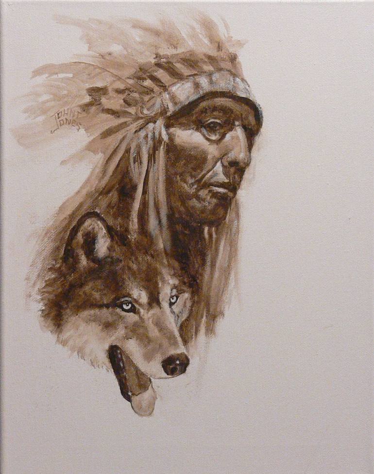 ACRYLIC MONOCHROME PAINTING ON STRETCHED CANVAS OF OLD INDIAN AND WOLF