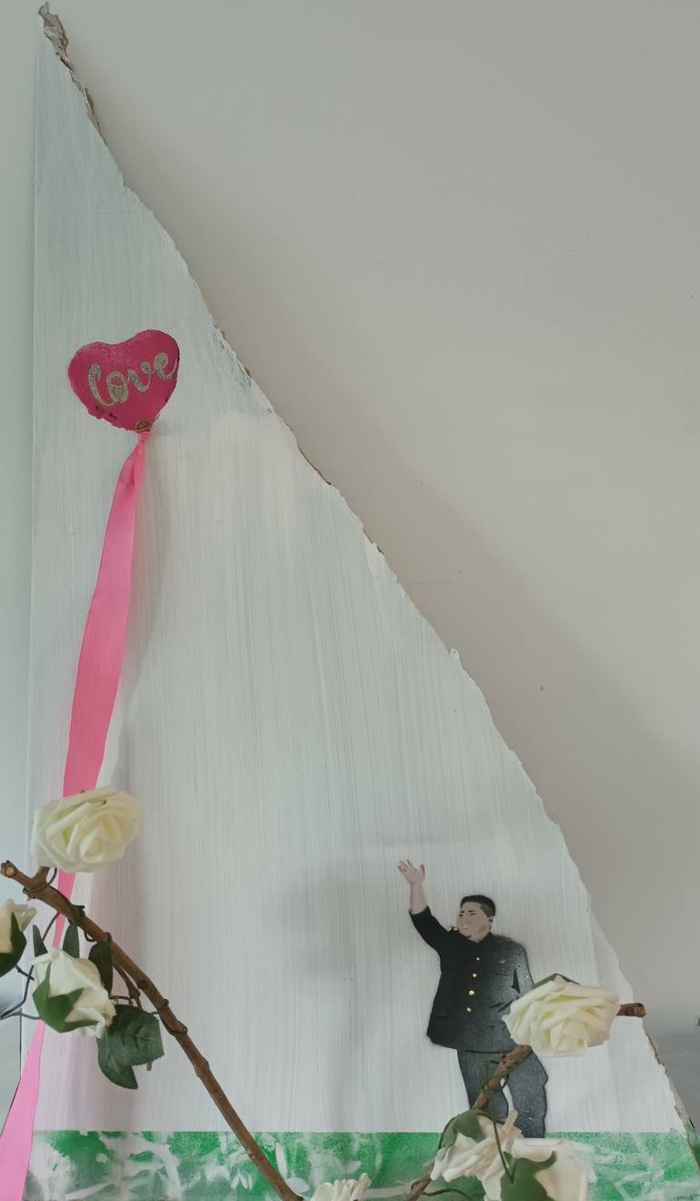 Dictator and Love balloon on a piece of wall (Plasterboard) attached pink ribbon and balloon tie end. Dictators yearn for admiration and Love, but a dictators very actions prevent them from obtaining which they desire so much. The ribbon is out of reach, but still long enough to be grasped. The pink...