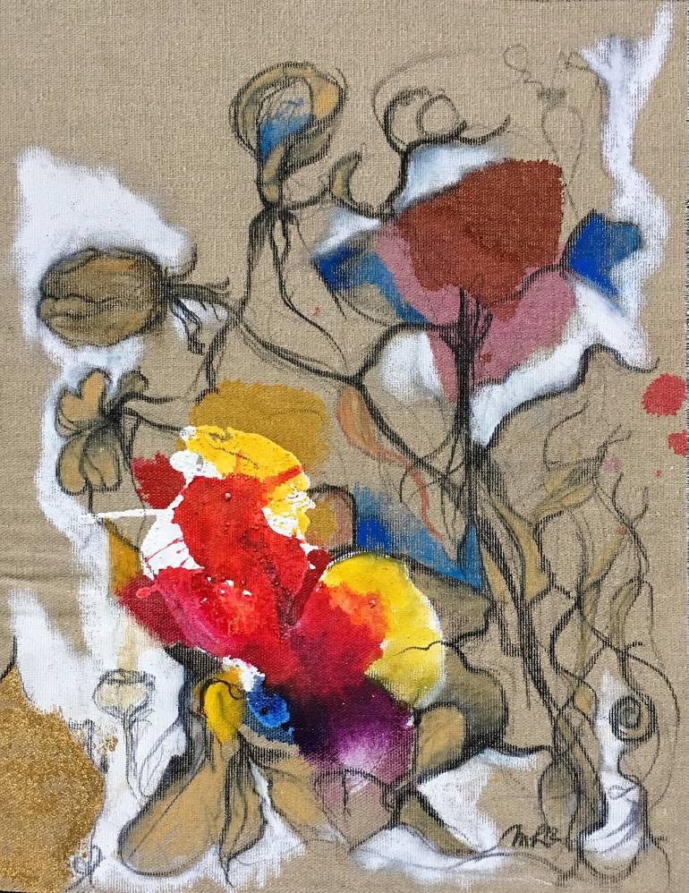 A painting with several media, first of all acrylic colors and pencils on raw canvas suitable for a framed picture with Passepartout behind glass.