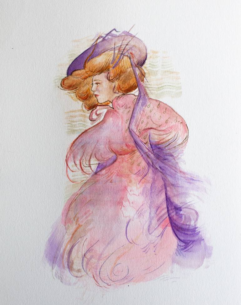 This is an original illustration of a young woman sporting a purple hat, mysteriously abounding on an adventure. She is inspired by ostentatious outfits of the Belle Époque period in French history.