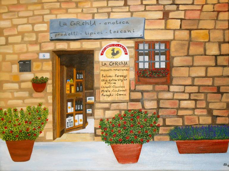 Painting of a typical "enoteca" located in the medieval village of Monteriggioni in Tuscany. Handmade item Only 1 available Materials used: oil painting on deep edges stretched canvas, unframed Unframed Hand signed on the front