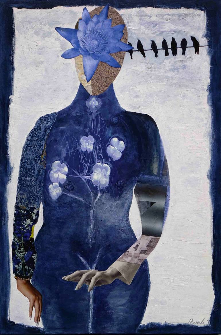 "La Dame Bleue" is a captivating, medium-sized original painting, a standout piece from a new series exploring the depths of indigo blue. This mixed media acrylic artwork features a woman, her image uniquely enhanced with the artist's original photographs, digitally colored and carefully integrated ...