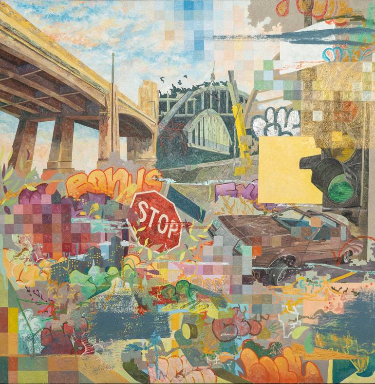 "La Moni", depicts a lowrider that is in a three wheel motion. The car is enveloped with graffiti, pixels and cityscape imagery drawing attention towards the lowrider. The work was inspired by my own experiences as a lowrider owner and artist. The sensory overload of the colors and imagery within th...