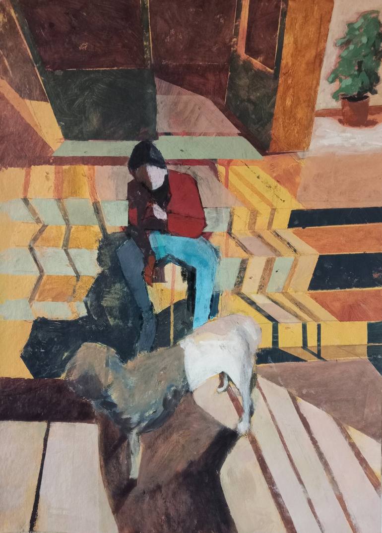 Kalu's first night out, a white puppy dog. Besides him there is also Krystian, sitting on the stairs. They are in the hall of an apartment building, both between light and shadow in the evening. Rigid cardboard, one millimeter thick, ready to be framed under glass or plexiglass.