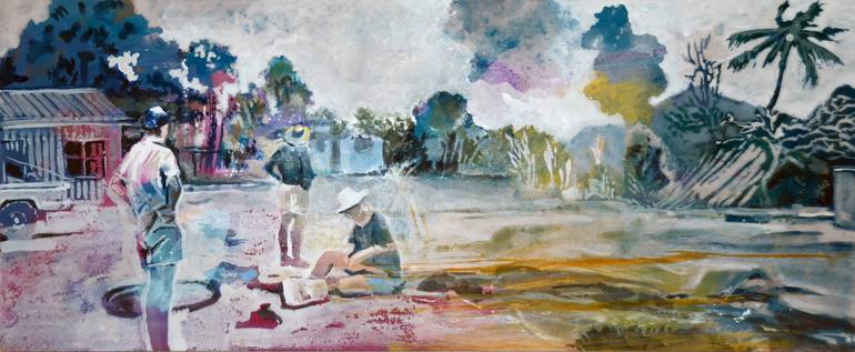 This painting is inspired by a found photography of a volcano eruption. Three men are watching this natural event and measuring its strength.