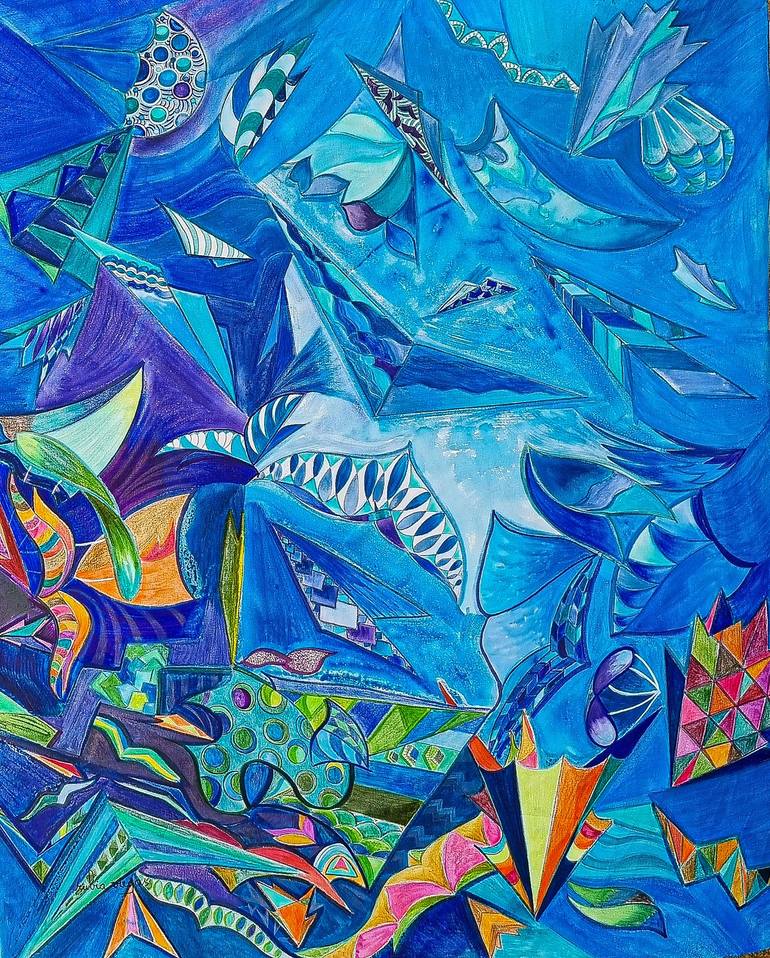 This artwork from 2022, measuring 71cm x 106cm, is a celebration of the free flight of the imagination. Created with the delicacy of watercolor and the expressiveness of Derwent bruttfuner and metallic oil pencil on canvas, it invites us to fly beyond the limits of reality.