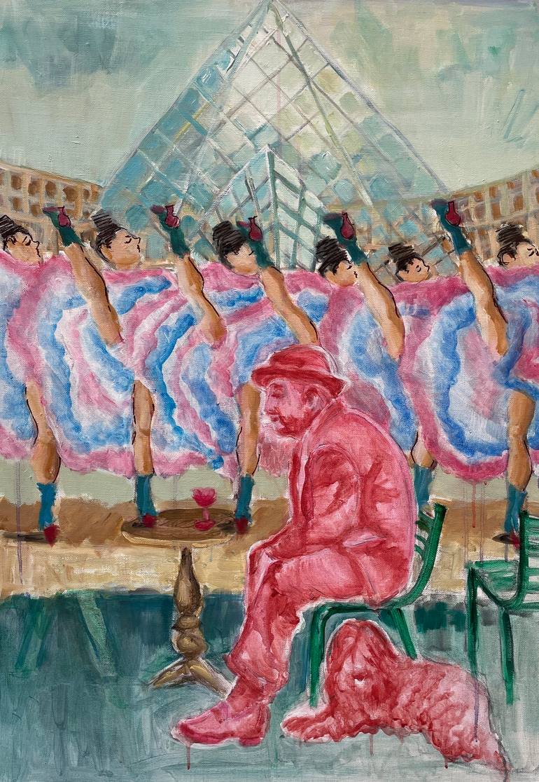 A novel and tender view of Parisian life (my adopted happy home for so many year) The Pyramide du Louvre towering in the background, a chorus line of high-kicking Can Can dancers being ignored by the elderly shabby-chic gentleman. Seated languidly in the Jardin du Luxembourg (note the green chairs)...