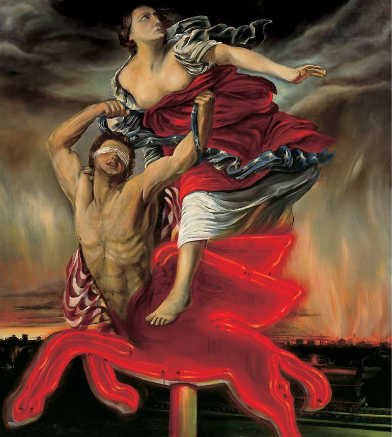 "Lady Liberty abducted by the Centaur Mobil" Based on the "Dieanira abducted by the Centaur Nessus painting by Guido Reni, this piece takes on another meaning for a post-modern world.