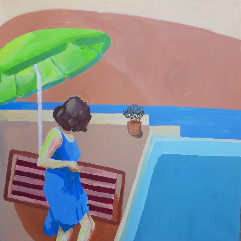 Lady in Blue is a series of paintings with the same theme made during the lockdown. The lady is outside by the pool with her chair under the arm in the shades of the sunshade. The nature plays a role in this art piece - the plant, the outside, the horizon frames the nature and makes a break possible...