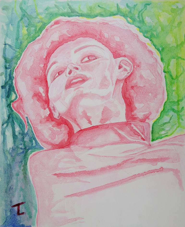 The inspiration was a photo from "Vogue" magazine. Especially her sigh, which was so powerful. The photo was black and white, but I saw it in color but the red was more adequate for the powerful woman. Water is an element strongly connected with a woman's energy. That is why I painted that portrait ...