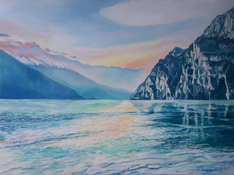 Original oil painting on canvas, handmade with author's signature. The Lake Garda painting fits perfectly into a modern or classic bedroom or living room interior. The image is kept in cool colors. The dominant color is blue with orange and yellow accents. The image shows a view of Lake Garda with a...
