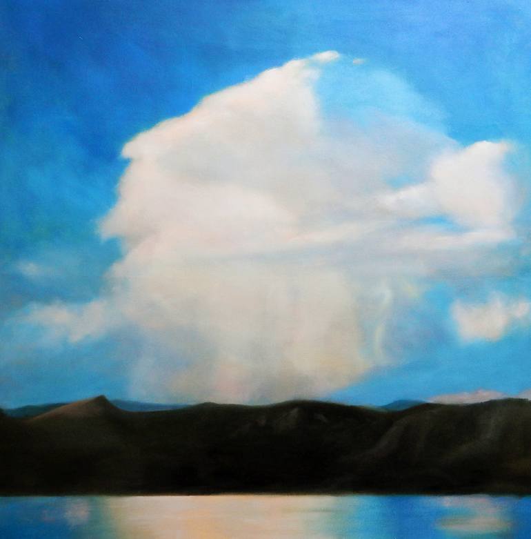 I was driving to the lake on a summer evening during a dramatic thunderstorm. The thunderhead, enormous and solitary, loomed over the lake creating this scene, ominous, with a luminous beauty. The painting is gallery wrapped canvas, ready to hang.