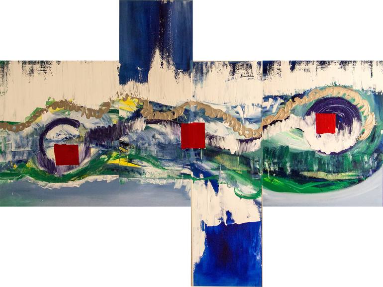 This painting consists of four paintings linked together to make one landscape The hills and sea of Ibiza blue green gold white