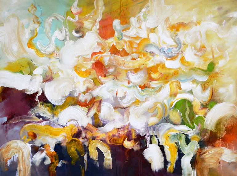 This abstract painting on vivid colors, it's an original painting created with professional acrylic paint on canvas. A great conversation starter, it has tones of white, orange, burgundy red, green, yellow and light blue. This abstract-impressionist work it's a gestural energetic abstraction with ex...