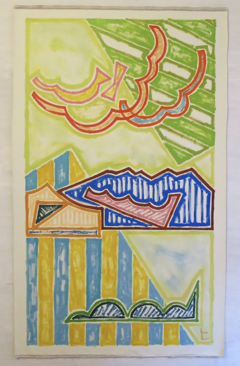 This vibrant composition explores a stylized Utah landscape through layered geometry, pastel stripes, and abstract canyon motifs. The green diagonals suggest cultivated terrain, while the floating coral arcs evoke sonic echoes or drifting clouds. A playful yet structured expression of open land and ...
