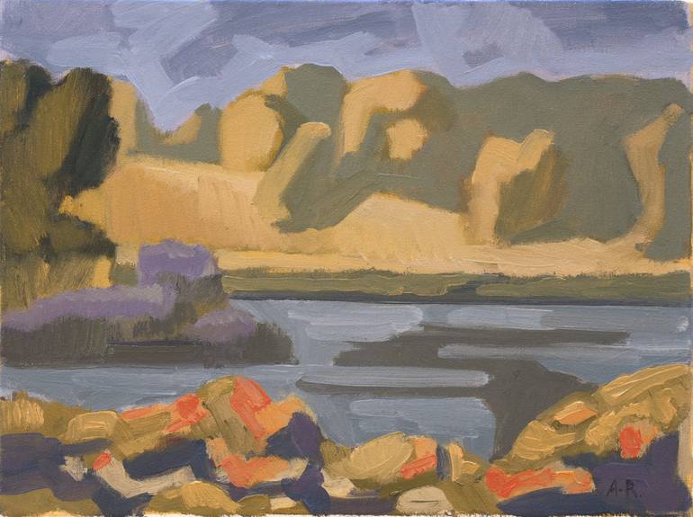 It’s a sunny day in a Midwest park with a pond. Trees, bushes and grasses are lit by the late afternoon sun. The landscape is painted with decisive brush strokes. Some brush strokes are in light impasto, but overall, the texture of the canvas shows through, which communicates lightness and ease. The...