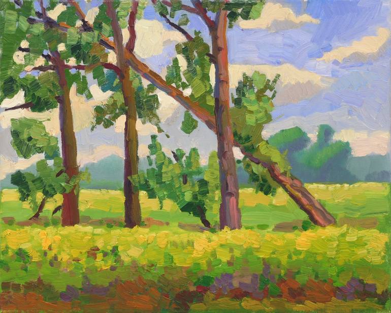 A sun-drenched Midwest field with blooming grasses. This painting focuses on color, with the relationships between color elements, their intensity, and the dialogues they create opening up another dimension of experience when viewing the scene. Brisk brush strokes add a rhythmic quality, evoking the...