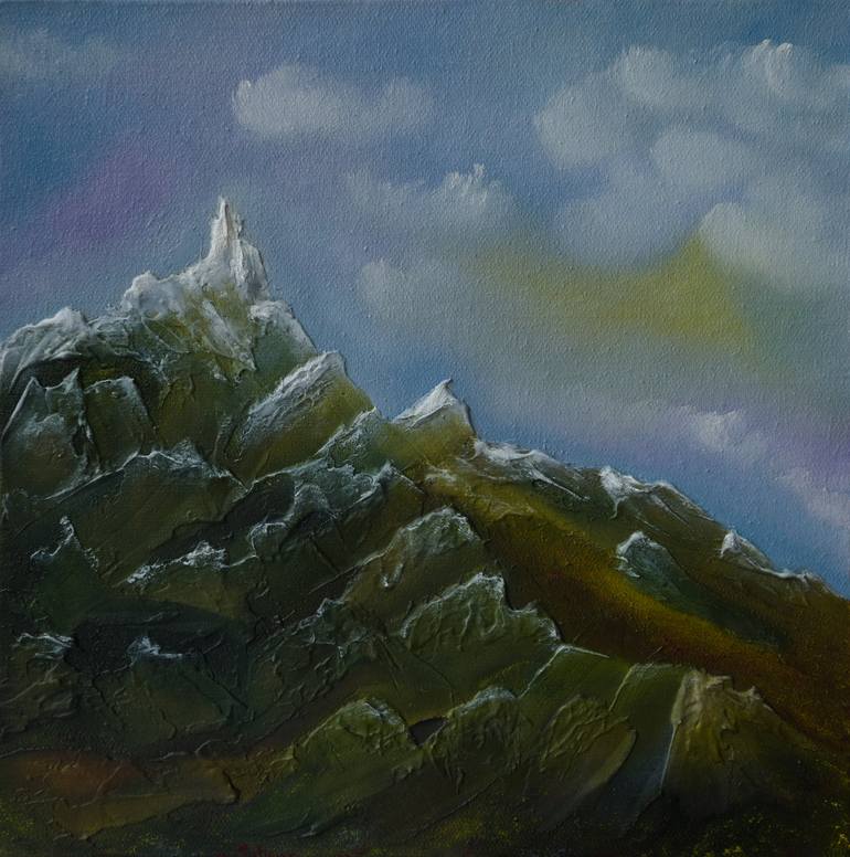 This painting captures the beauty of mountain peaks and the serene landscape. The textured brushstrokes bring the rugged terrain and snow-capped summits to life, evoking a sense of tranquility and grandeur. Inspired by the natural world, this piece invites viewers to experience the peaceful solitude...