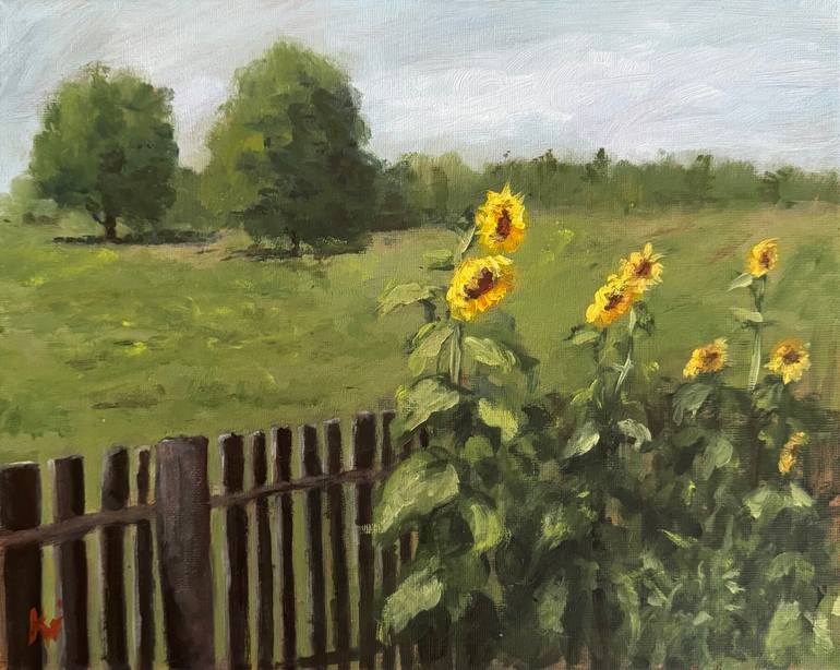 Oil painting on canvas , sunflowers, greenery, beautiful landscape