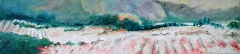 (20 x 80 cm) Original impressionist landscape, reflecting the beauty of the fertile land of Murcia, Spain. Cherry treas, mountains and the river bringing water all along the valley.