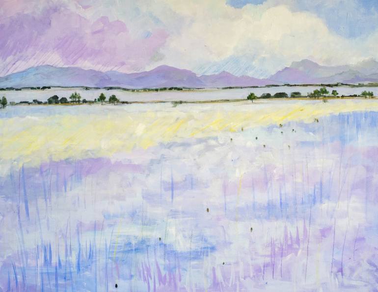 This painting depicts a serene and delicate landscape dominated by soft hues of lilac, blue and yellow. The setting appears to be a rural or flooded area, with the reflection of light on the surface suggesting a flooded field or one covered in undergrowth. In the background, a line of trees and shr...